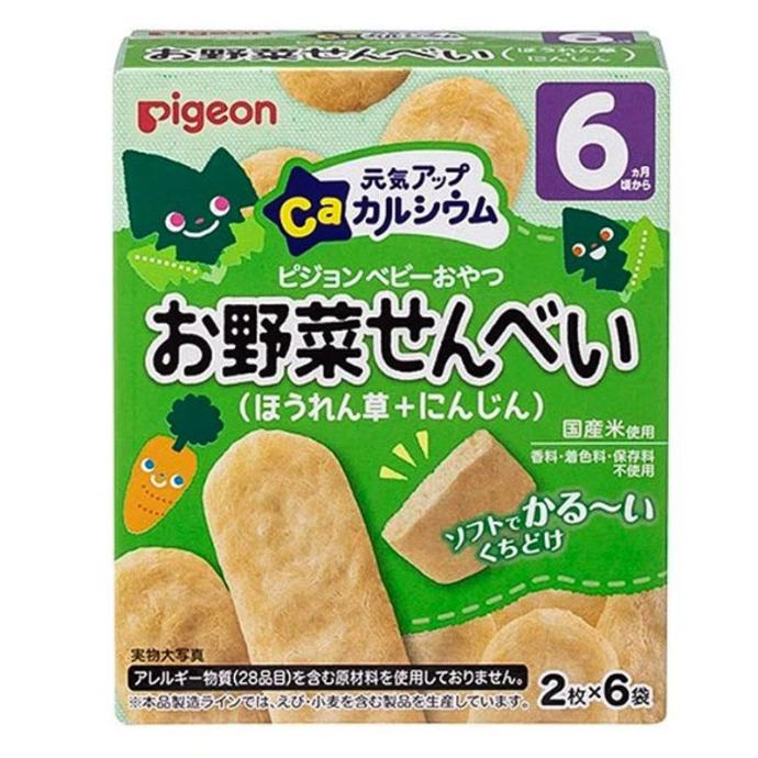 Bánh gạo rau củ Pigeon được làm từ gạo Nhật Bản kết hợp rau bina (cải bó xôi) và cà rốt, mang đến hương vị tự nhiên, dễ ăn. Kết cấu bánh mềm xốp, dễ tan trong miệng giúp bé tập nhai, hạn chế nguy cơ hóc nghẹn.