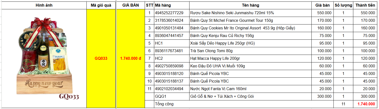 | 12 | Giỏ Gỗ & Nơ + Túi Xách + Công Gói | GQG1 |