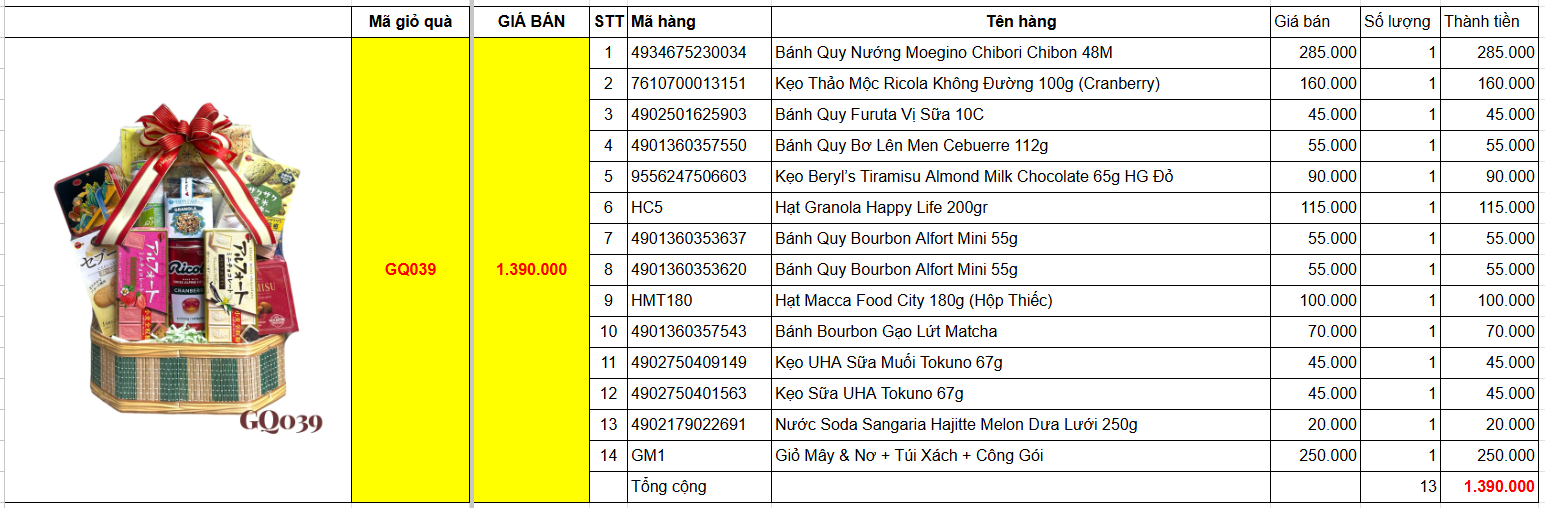 | 14 | Giỏ Mây & Nơ + Túi Xách + Công Gói | GM1 |
