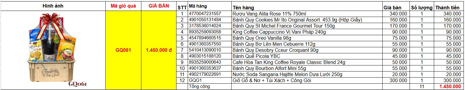 | 12 | Giỏ Gỗ & Nơ + Túi Xách + Công Gói | GQG1 |