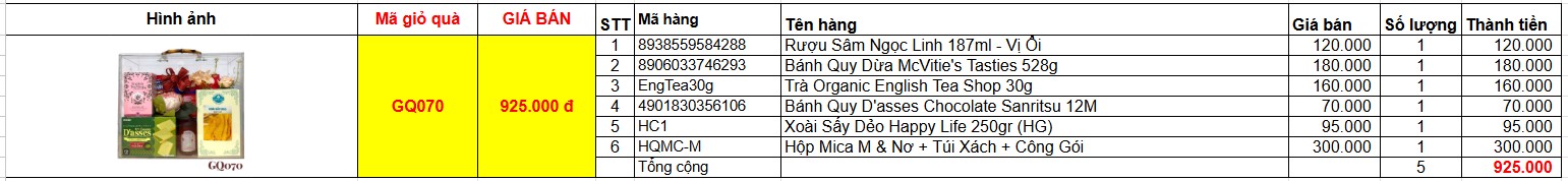 | 1 | Rượu Sâm Ngọc Linh 187ml - Vị Ổi | 8938559584288 |