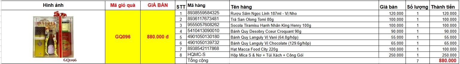 | 1 | Rượu Sâm Ngọc Linh 187ml - Vị Nho | 8938559584325 |