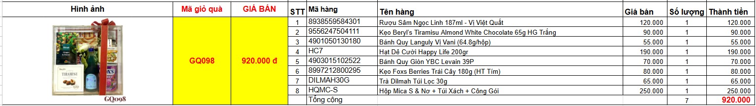 | 1 | Rượu Sâm Ngọc Linh 187ml - Vị Việt Quất | 8938559584301 |
