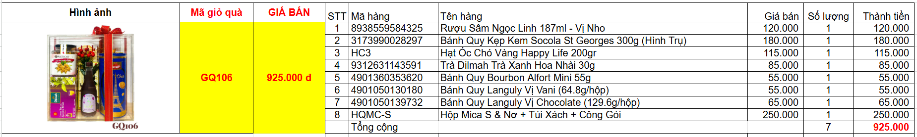 | 1 | Rượu Sâm Ngọc Linh 187ml - Vị Nho | 8938559584325 |