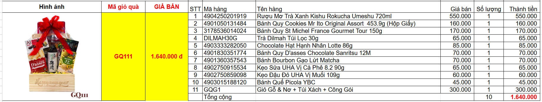 Bảng giá chi tiết giỏ quà tết GQ111