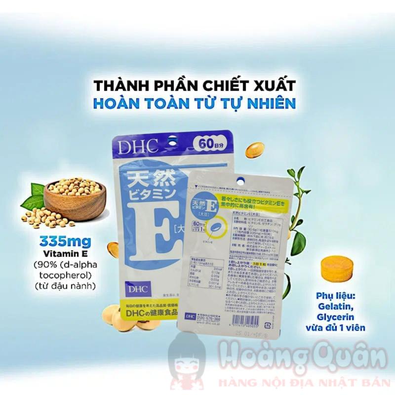- Viên uống DHC bổ sung Vitamin E 60 viên được chiết xuất hoàn toàn từ các thành phần thiên nhiên, bao gồm Vitamin E (Tocopherol) từ hạt đậu nành, bí ngô và một số loại hạt khác.